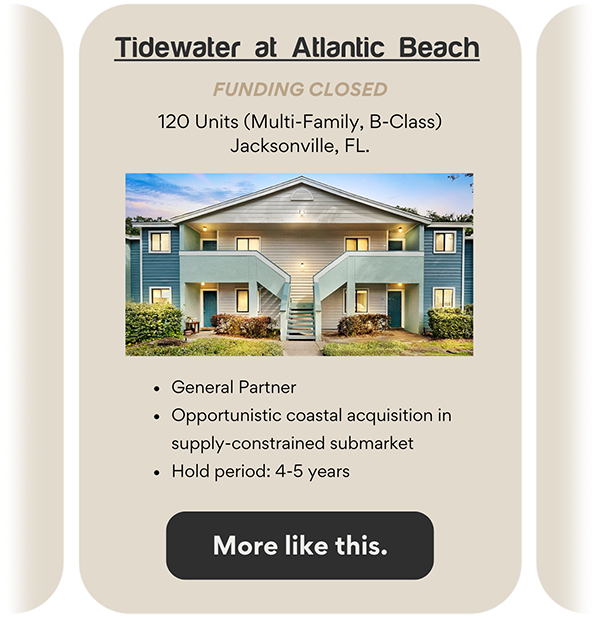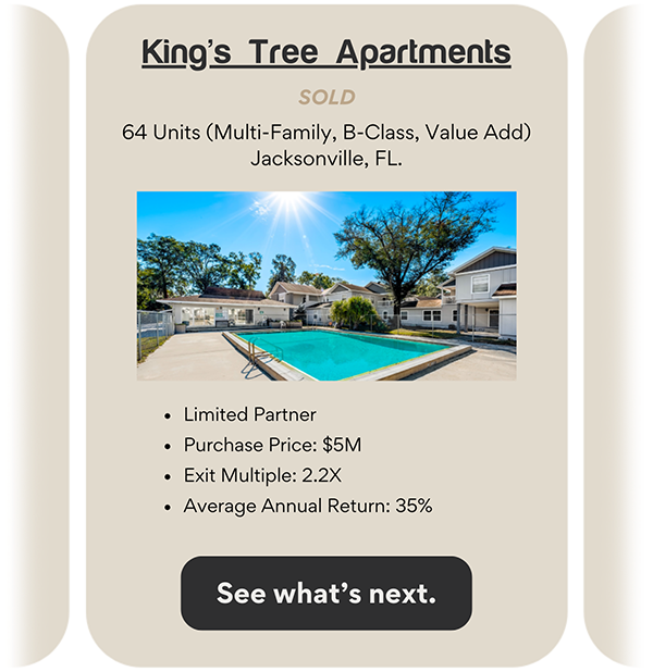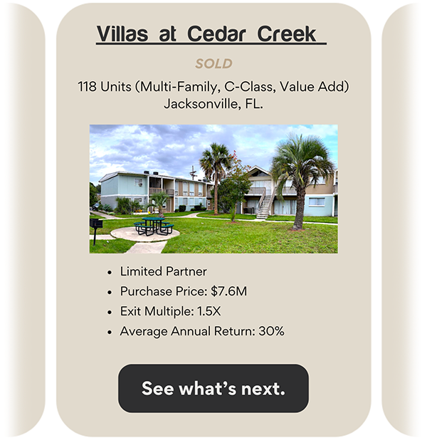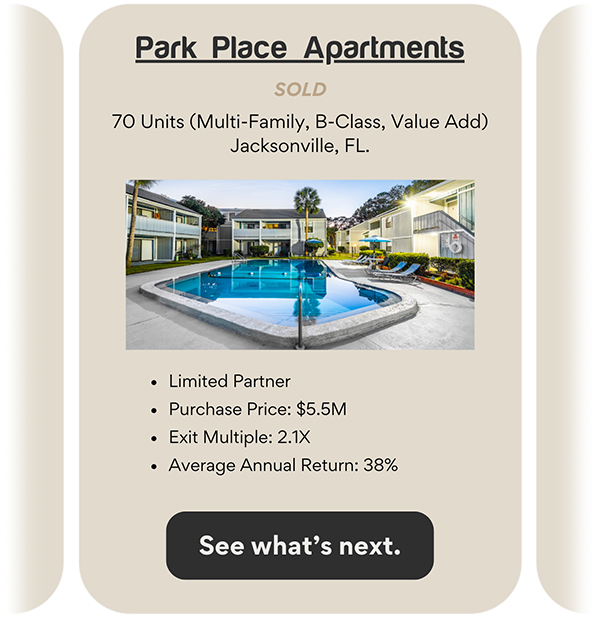 Fast forward, we still have the real estate bug today. We spend our time building partnerships with seasoned pros, gaining access to the best deals, analyzing hundreds of potential opportunities, helping investors ask the right questions, and uncovering the best returns for our limited partners.